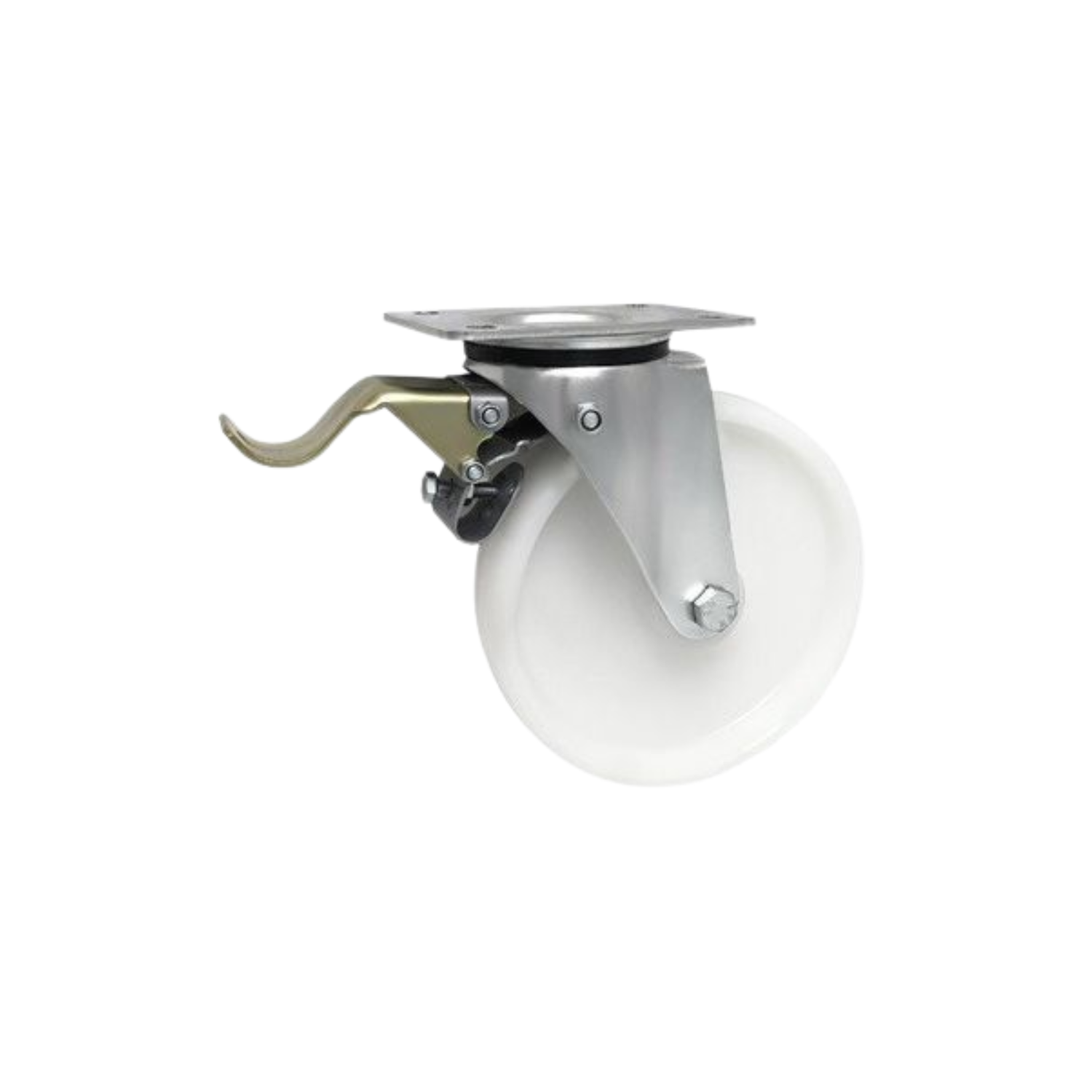Koła tworzywowe w obudowie skrętnej firmy ZABI składają się z koła poliamidowego PA 6 oraz ze stabilnej stalowej obudowy tłoczonej z płytką mocującą wraz z hamulcem mechanicznym. Koło występujące w tej obudowie osadzone jest na tulejce, montowane jest z kielichem obudowy za pomocą śruby i nakrętki.