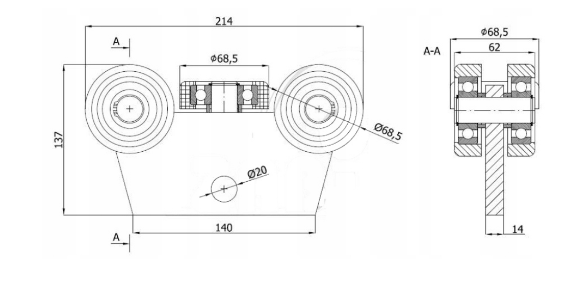 Oferowany 5 rolkowy wózek bez podstawy (wahadło wózka) do bram przesuwnych przeznaczony jest do profilu o wymiarach 80x80x5mm. Wózek o dopuszczalnym obciążeniu do 800kg posiada 4 rolki metalowe i 1 rolkę poliamidową