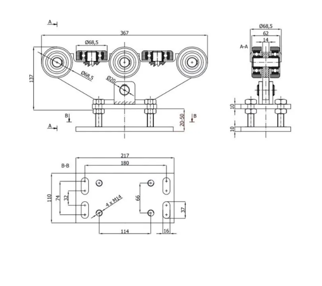 Rolka pozioma w wózku pełni rolę rolki prowadzącej, natomiast rolki pionowe to rolki nośne. Podstawa wózka do bram przesuwnych posiada 4 otwory podłużne które umożliwiają regulacje położenia. Montaż wózka odbywa się poprzez przyspawanie wózka do konstrukcji metalowej bądź za pomocą śrub. Oferowany wózek jest wózkiem wahliwym z możliwością regulacji wysokości.