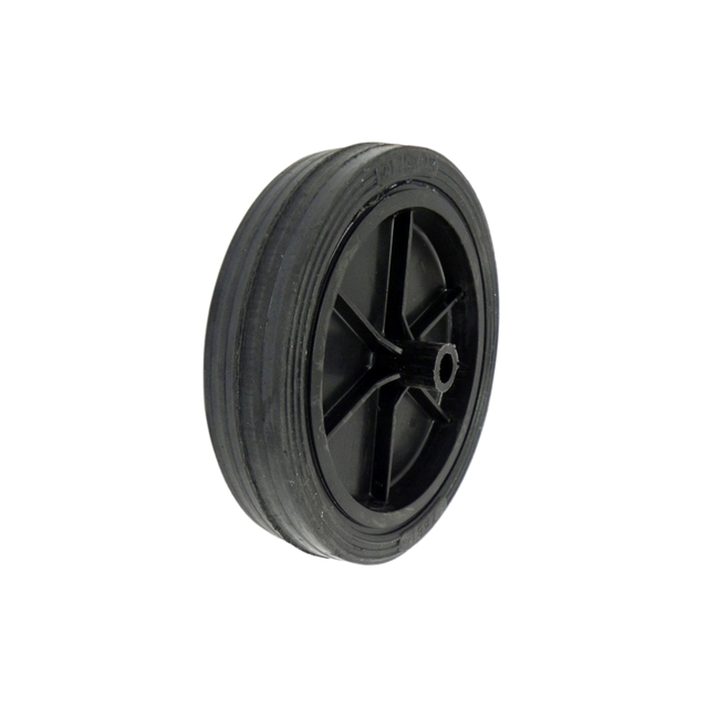 Jednolity korpus koła wykonany jest wtryskowo z polipropylenu w kolorze czarnym. Opona koła wykonana z gumy pełnej w kolorze czarnym. Koła i kółka do kosiarek charakteryzują się niskim oporem toczenia.