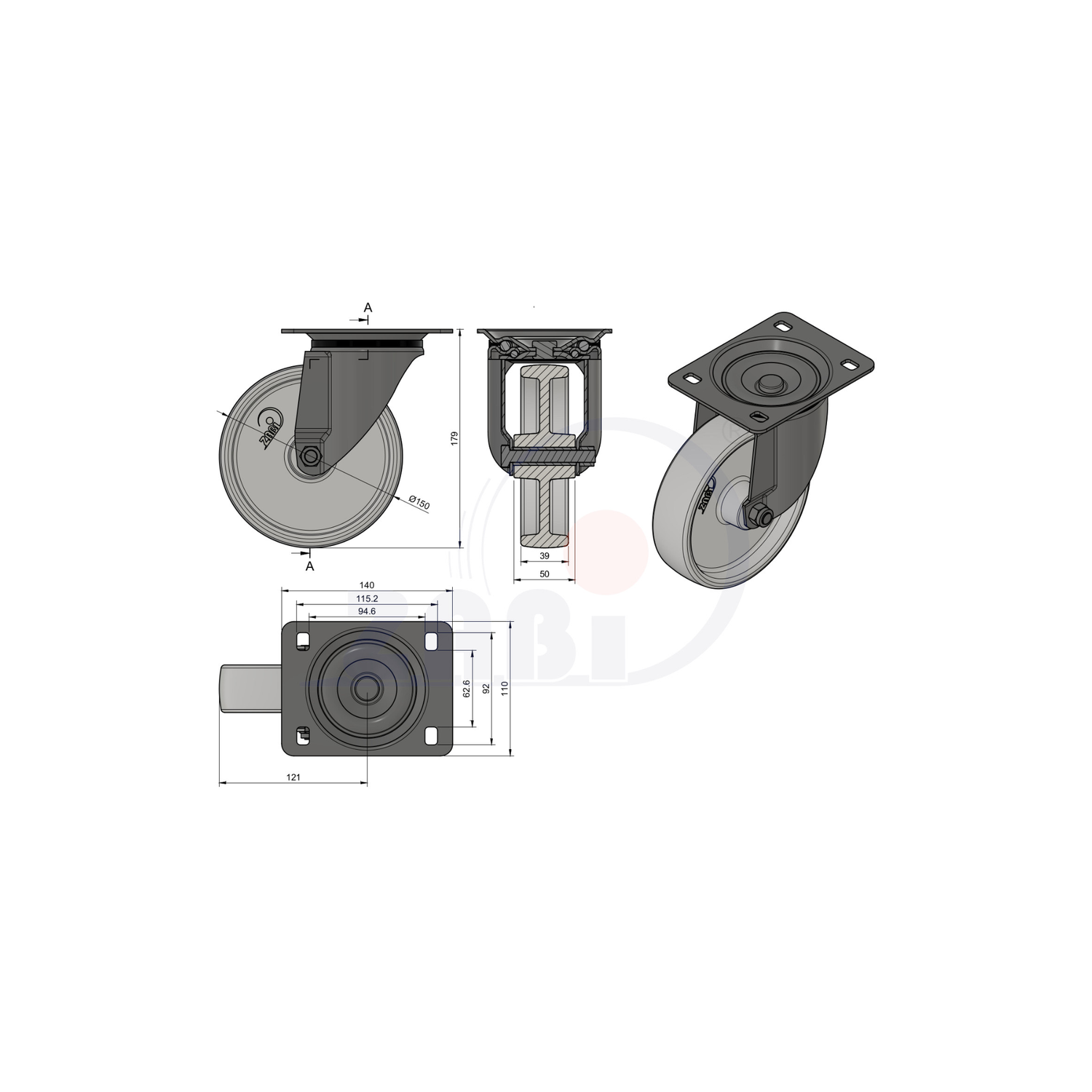 Koło poliamidowe fi 150mm w obudowie skrętnej do wózków i maszyn - 72B9