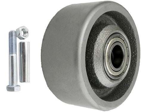 Koło żeliwne o średnicy 100mm do dużych obciążeń składa się z jednolitego, obrabianego maszynowo korpusu z odlewu żeliwnego. Koła występują z łożyskiem kulkowym. Łożysko kulkowe osadzone jest w piaście żeliwnej koła z tuleją dystansową. Koła żeliwne są pokryte farbą proszkową w kolorze srebrnym. Cechują się wysoką wytrzymałością na obciążenia i posiadają wysoką odporność na zużycie. Mogą pracować w szerokim zakresie temperatur od -50 do +150°C. Koła żeliwne są bardzo odporne na ścieranie, uderzenia i zarysowania oraz niewielkim oporem toczenia. W przypadku podłoża wrażliwego należy mieć na uwadze względnie wysoki nacisk koła na podłoże. Koło z żeliwa sprzedawane jest w zestawie ze śrubą i tuleją dystansową.